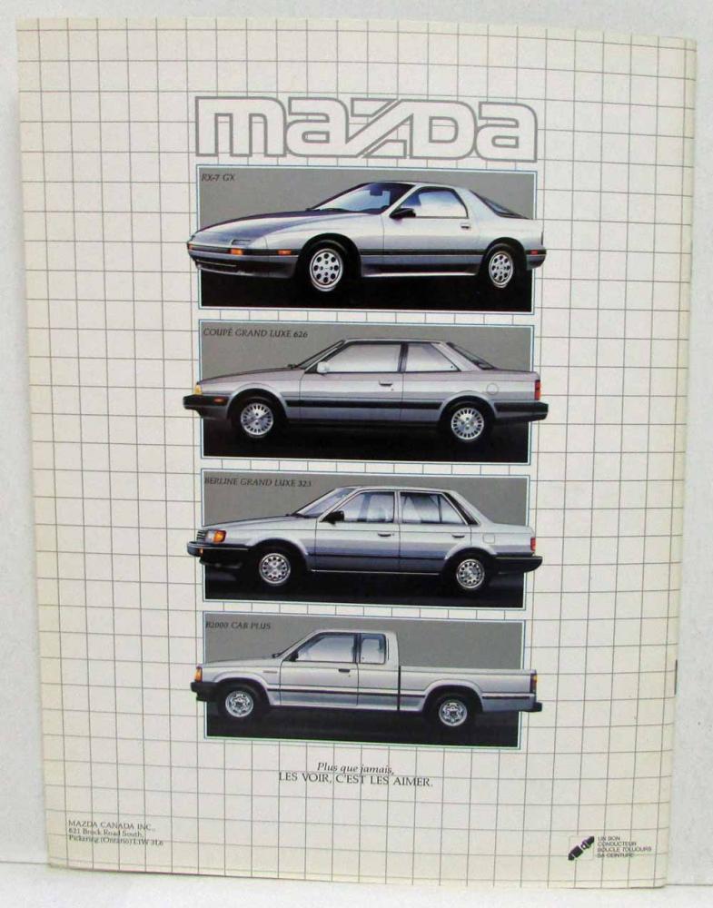 1986 Mazda 323 Sales Brochure. Contents: Apercu Technique. Berline 323LX (323LX Sedan). Berline 323DX (323DX Sedan). Finition Interieure 323 LX ET DX (323 LX AND DX Interior Finish). Hatchbacks 323 LX, DX ET Base (Hatchbacks 323 LX, DX ET Base). Finition Interieure Des Hatchbacks 323 (Interior Finish Hatchbacks 323). 323 GT (323 GT). Familiales 323 Grand Luxe Et De Luxe (Family 323 Grand Luxury And Luxury). Les Accessories Derniere Touche (The Last Touch Accessories). Caracteristiques et Equipment (Features and Equipment). Condition: Rusty on staples. Some soiling/spotting. Bent corner. See pics. Note: French Canadian
