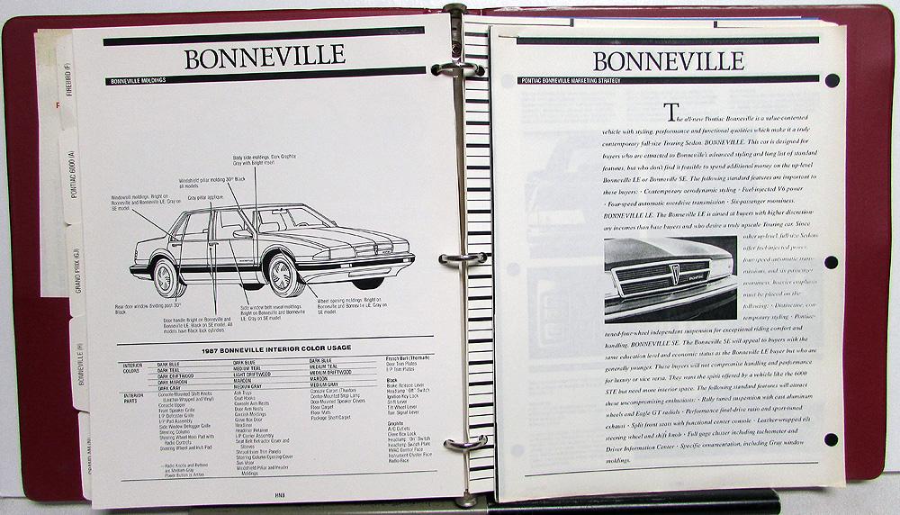 This is an original 1987 Pontiac Product Book, Fleet Edition. It is in good condition with minor, blemishing and soiling [see photos]. It was put together to be an easily accessed resource for the salesmen to use when helping a customer place an order, answering any questions, or just to promote the line to people who buy multiple vehicles for a business. Included are color options, very nice photos, diagrams, and more for the Fiero, Firebird, Pontiac 6000, Pontiac 1000, Sunbird, Grand Am, Grand Prix, Bonneville, and Safari Wagons.