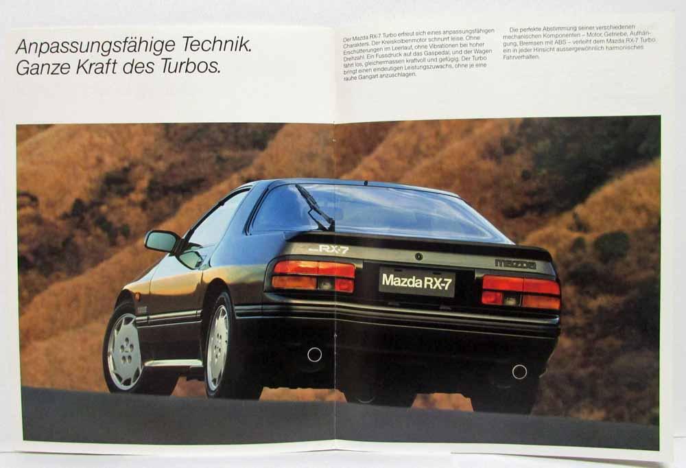 1988-1991 RX-7 Turbo Sales Brochure. Rhythmus der Formen. Harmonie der Linien. Ausgiebig erprobte Technik, damit Technologie und Okologie Hand in Hand gehen. Anpassungsfahige Technik. Ganze Kraft des Turbos. Technische Daten RX-7 Turbo. (Rhythm of forms. Harmony of the lines. Extensively proven technology so that technology and ecology go hand in hand. Adaptable technology. Whole power of the turbo. Specifications RX-7 Turbo.) Note: German Text for Swiss Market