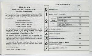 1988 Buick Century Estate Wagons Owners Operators Manual Original. This manual contains operation, service/maintenance and general instructions along with illustrations.