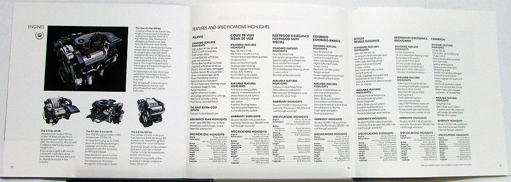 Original, smaller version sales brochure for the 1988 Cadillacs (Allante', De Ville, Fleetwood & D'Elegance, Eldorado, Seville, Brougham, and Cimarron). Glossy, captioned photos throughout of interiors and exteriors. Read about engines, features, and specifications highlights for each model, assurance plan, available features, and more. Good condition.