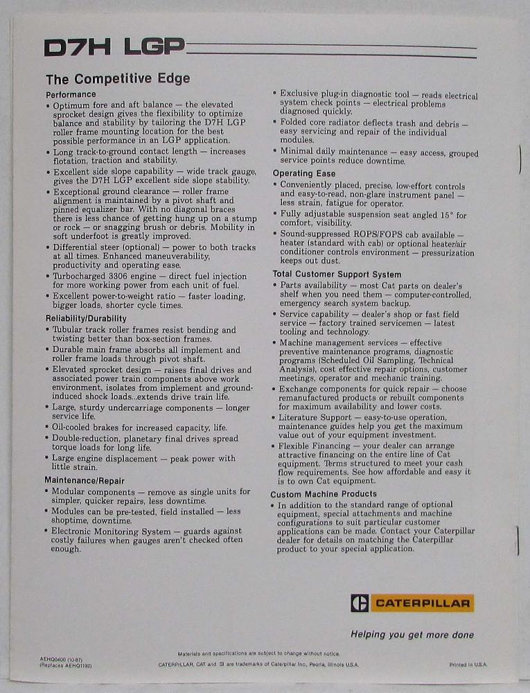 1988 Caterpillar D7H LGP Track-Type Tractor Sales Brochure. Original.