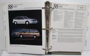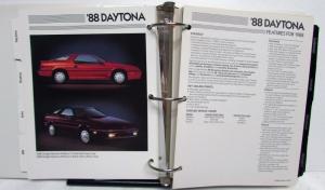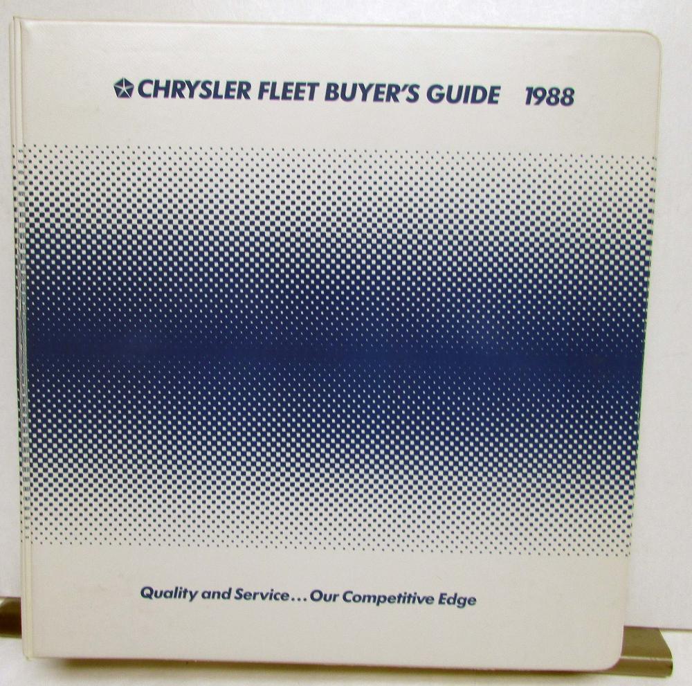 This is an original 1988 Chrysler Fleet Buyers Guide, it is in good condition and was put together to be an easily accessed resource for the salesmen in helping the customer placing an order, answering questions, or just promoting the line. Included are features, options, photos, and more for the Omni America, Shadow, Aries K, 600, Daytona, Lancer, Diplomat, Dynasty, Caravan, Colt, Colt Vista, Dakota Pickup, Ram Pickup, Ramcharger, Mini Ram Van, Van, Wagon, Ram 50, Sundance, Reliante, Caravelle, Gran Fury, Voyager, LeBaron, New Yorker, Fifth Avenue, Conquest TSi, and Raider. The tab Bulletins and Fleet News is empty. Either the dealership never added them when they received them, or they just were never sent out, either was a common occurrence.