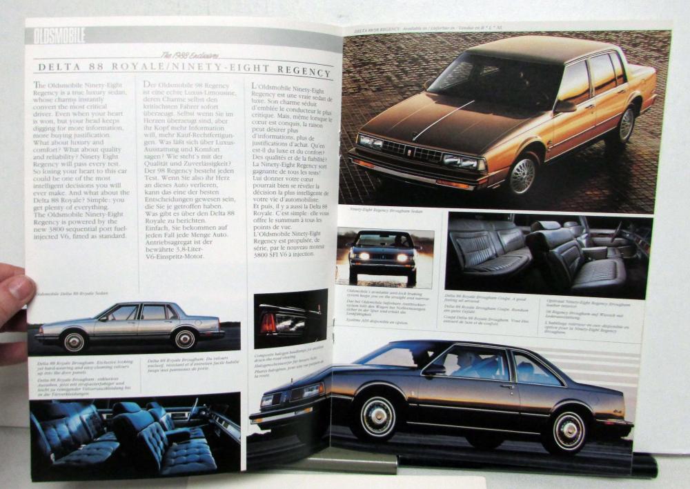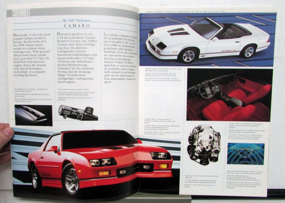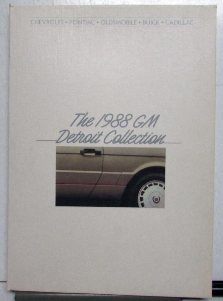 This is an original 1988 GM Detroit Collection, IN ENGLISH, GERMAN, AND FRENCH. which features models from Chevrolet, Pontiac, Oldsmobile, Buick, and Cadillac in four catalogs, that fit into a paper sleeve. This was made to show off wheel covers, features, specifications, very nice photos, and much more. This is a great collection and a must-have for any motoring enthusiast!