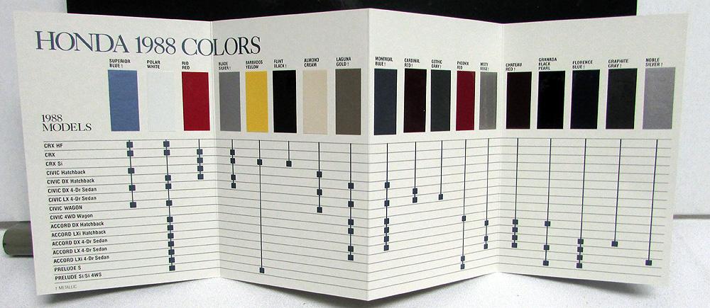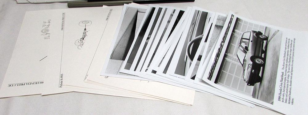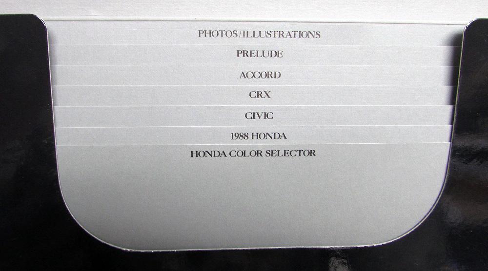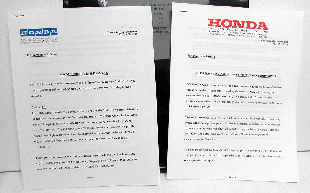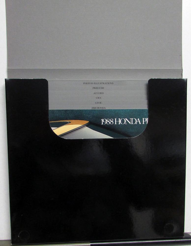Original 1988 Honda Press Kit. Custom Folder, Color Selector, Photos, Illustrations and Information Sheets. Models include Accord, Prelude, Civic & CRX. The Media Kit highlights the Full Line of Honda Models for 1988. It also includes a Honda Prelude Sales Brochure. All is in good condition with minor wear and blemishing [see photos]. Very rare and informative piece of automotive history that will make a great display item.