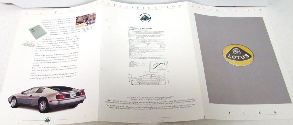 Original 1988 Lotus Esprit Dealer Prestige Sales Brochure/Folder. The Custom Folder holds the Sales Brochure which highlights the Esprit Turbo Sports Car for the American Market. It has minor wear and staining. Very rare and informative piece of automotive history that will make a great display item.