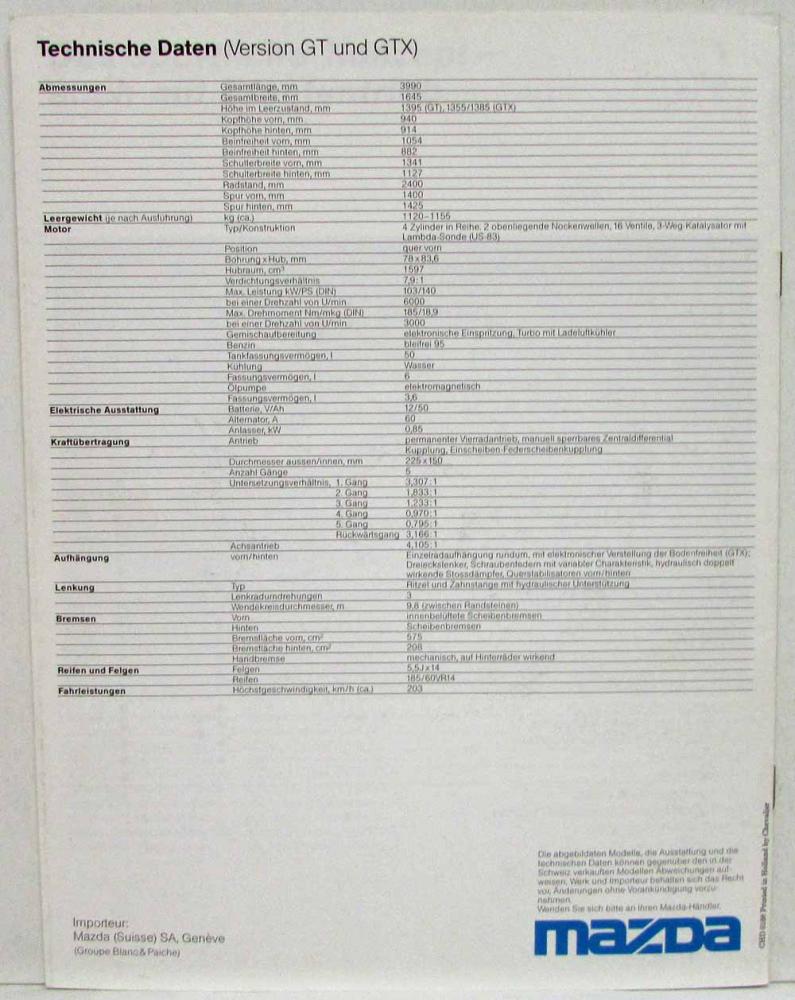 1988 Mazda 323 4WD Turbo 16V Sales Brochure. Meisterhaft in Form. Permanenter Vierradantrieb. Der dynamische Fahrstil. Ein Fahrwerk fur hohe Leistung und optimalen Komfort. Kraft und Leistung sind kein Produkt des Zufalls. Extravagantes Ausstattungsniveau fur einen hohen Gegenwert. Das sportliche Konzept - auch mit Frontantrieb. Mazda 323 4WD: eine super-komplette Ausstattung.Technische Daten Version GT und GTX. (Masterful in shape. Permanent four-wheel drive. The dynamic driving style. A chassis for high performance and optimum comfort. Power and performance are not a product of chance. Extravagant equipment level for a high value. The sporty concept - also with front wheel drive. Mazda 323 4WD: a super-complete equipment. Technical data version GT and GTX.) Note: German Text for Swiss Market
