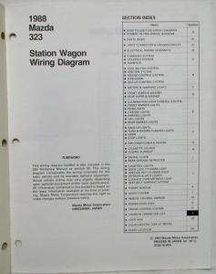 1988 Mazda 323 Station Wagon Electrical Wiring Diagram Service Manual. This wiring diagram booklet is also included in the 323 Workshop Manual (NOT included) as section 50. This wiring diagram incorporates the wiring schematic for the basic vehicle and its available optional equipment. Actual vehicle wiring may vary slightly depending upon optional equipment and/or local specifications. This manual was used by the Mazda Dealership technicians to help diagnose and identify electrical problems on the 323 Station Wagon.
