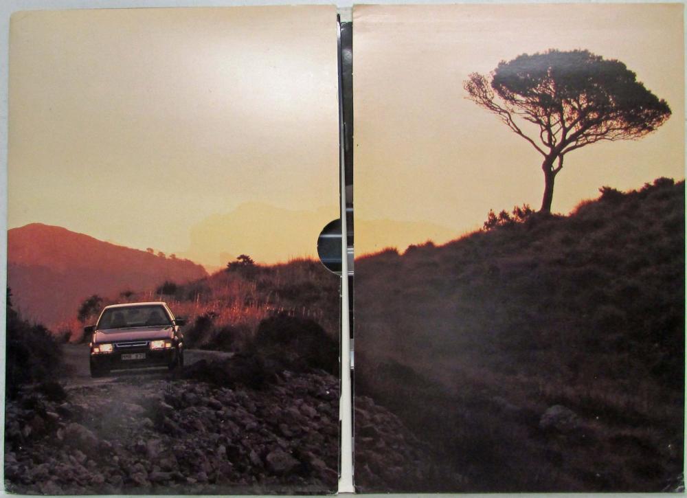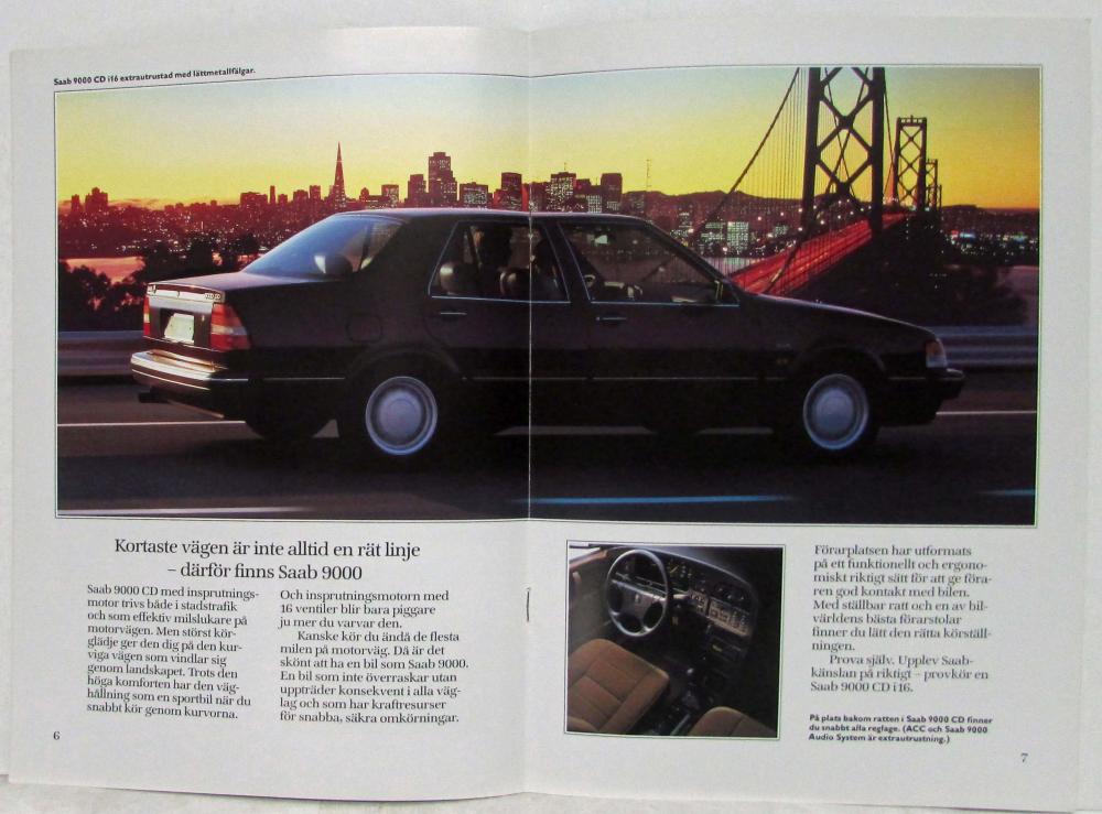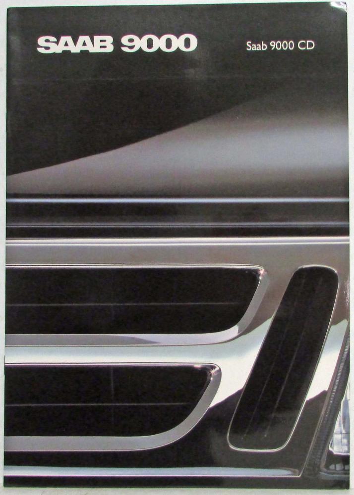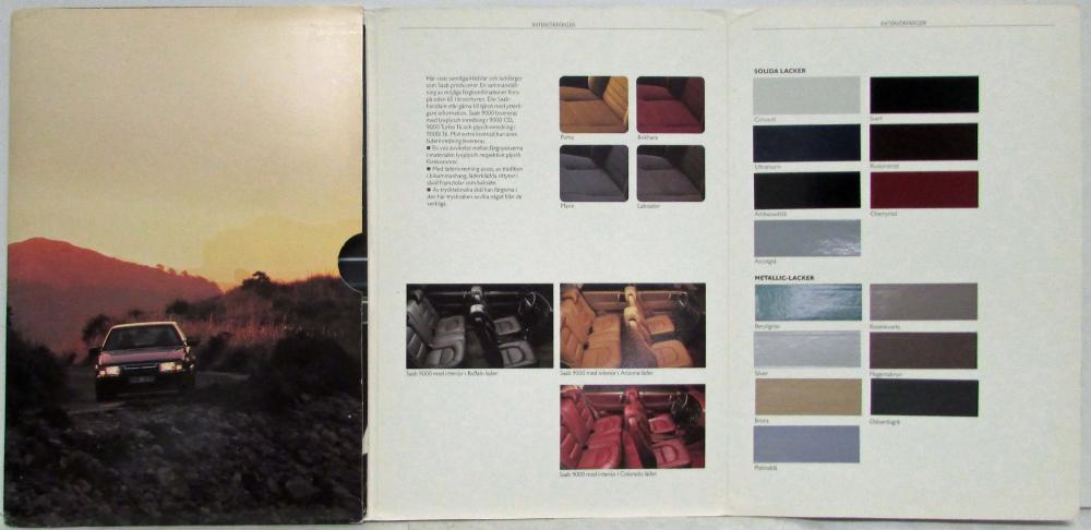 Tri-fold folder holds Saab 9000CD, 9000 Turbo 16, 9000i 16 and Saab 9000 CD brochures. Inside of folder shows interior and exterior colors.
