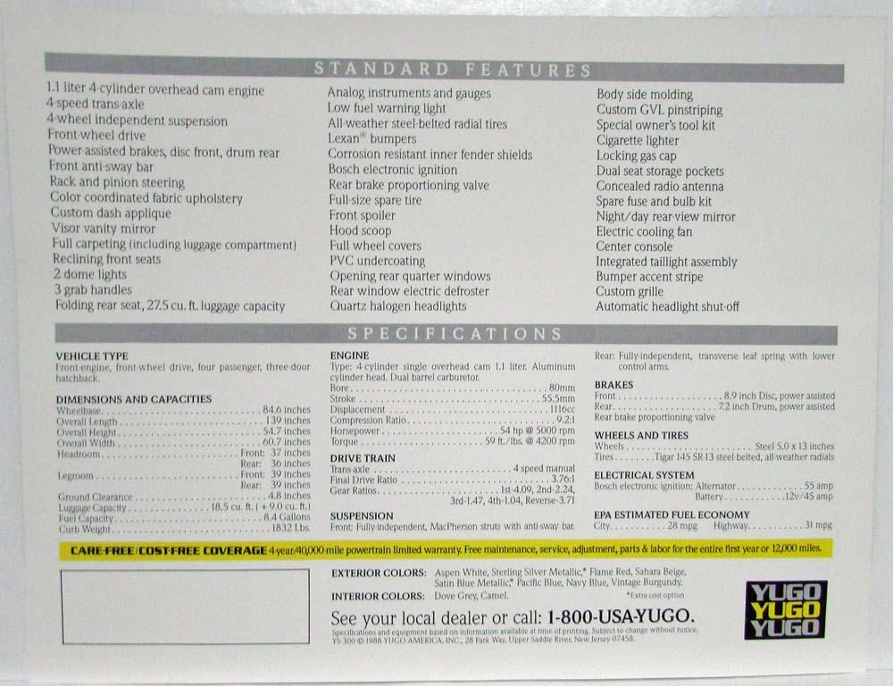 1988 Yugo GVL Sales Spec Sheet. Original. That L probably stood for Luxury. Just look.