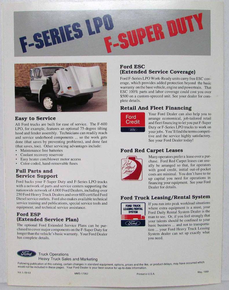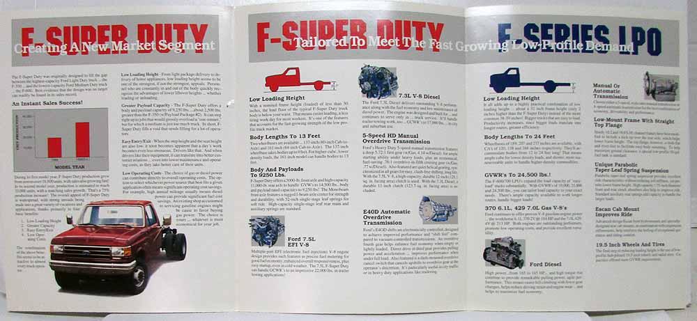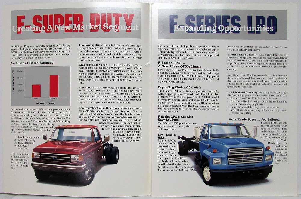1989 1990 Ford F-Super Duty & F-Series LPO Sales Folder. F-Super Duty creating a new market segment. The F-Super Duty was originally designed to fill the gap between the highest-capacity Ford Light Duty truck...the F-350...and the lowest-capacity Ford Medium duty truck...the F-600. Best evidence that the design was on target can readily be found in its sales record. F-Series LPO (Low Profile Option) expanding opportunities. The success of Ford's F-Super Duty is spreading rapidly to bigger units offering the same basic appeals, but the capacity to handle bigger loads. In effect, it's creating a new class of medium duty trucks...but trucks that are as uncomplicated and easy to buy as F-Super Duties. Condition: Small hole in cover. See pics.