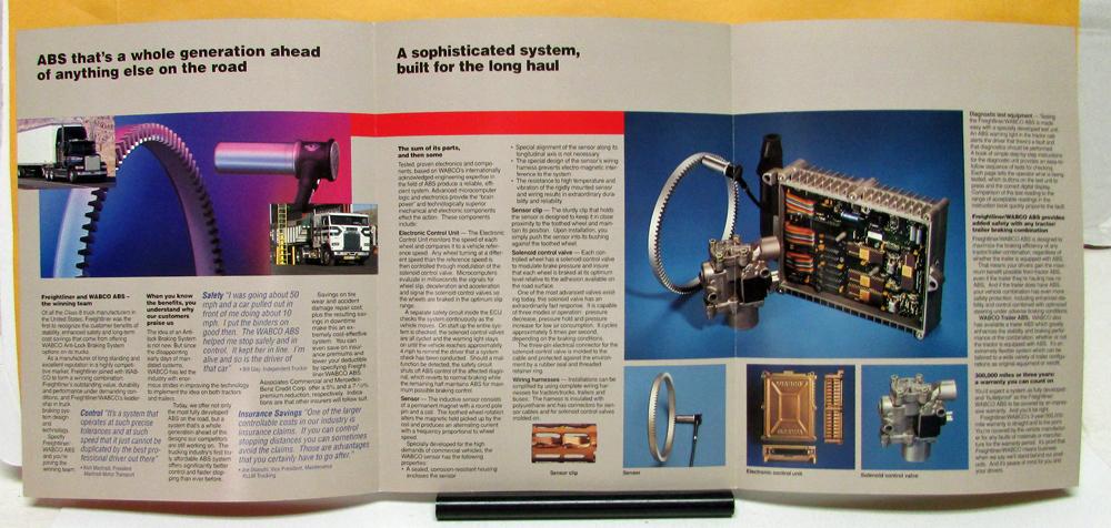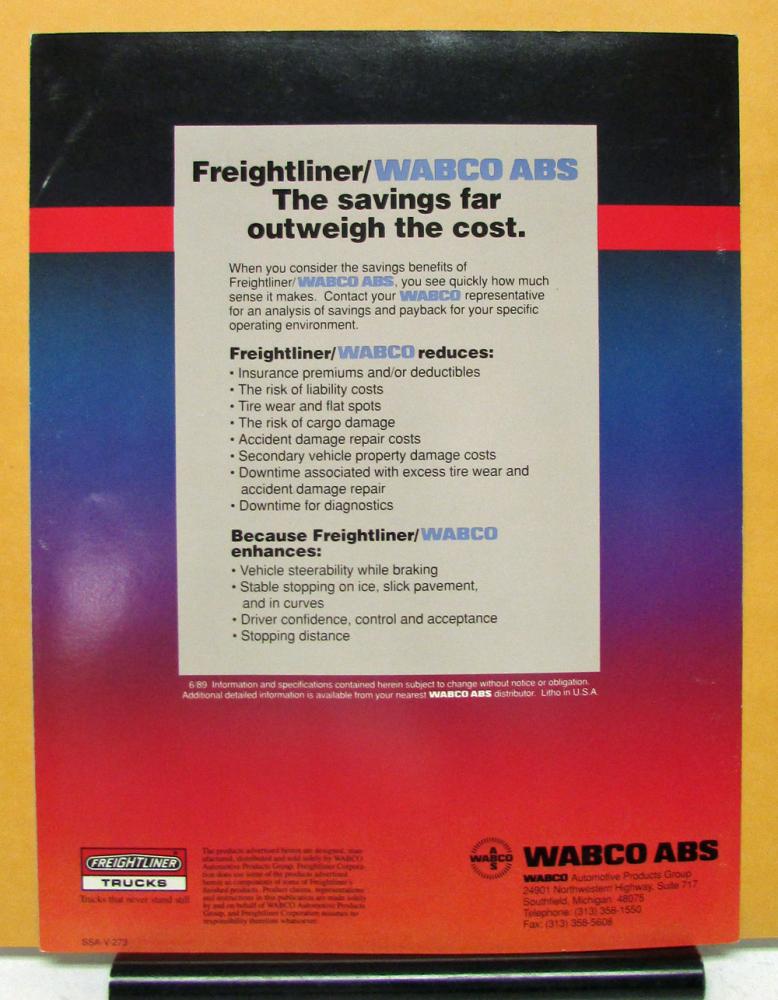 1989 Freightliner Truck "WABCO Anti Lock Braking System" Sales Folder. The front page has a very good picture of a Freightliner truck. The inside has color pictures of the ABS system and information about its features. The back page talk about the savings with a WABCO ABS.