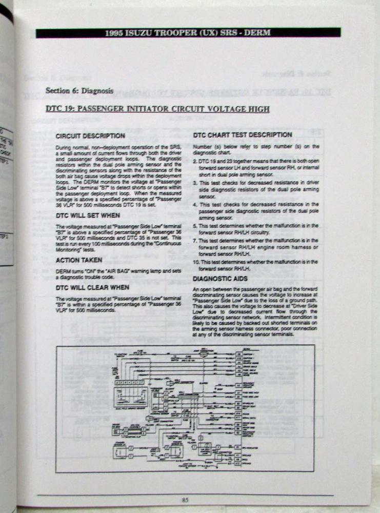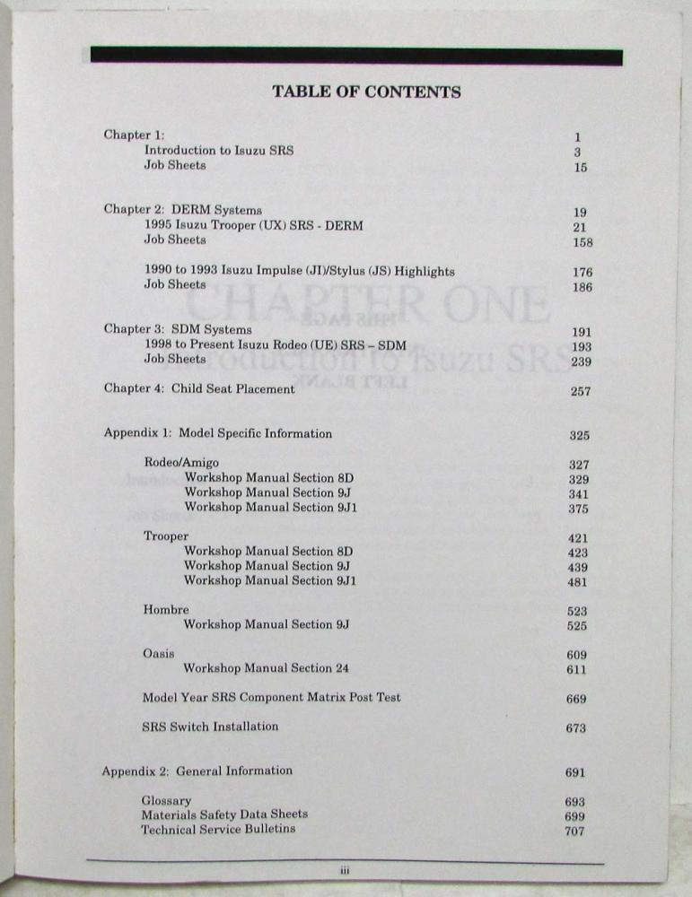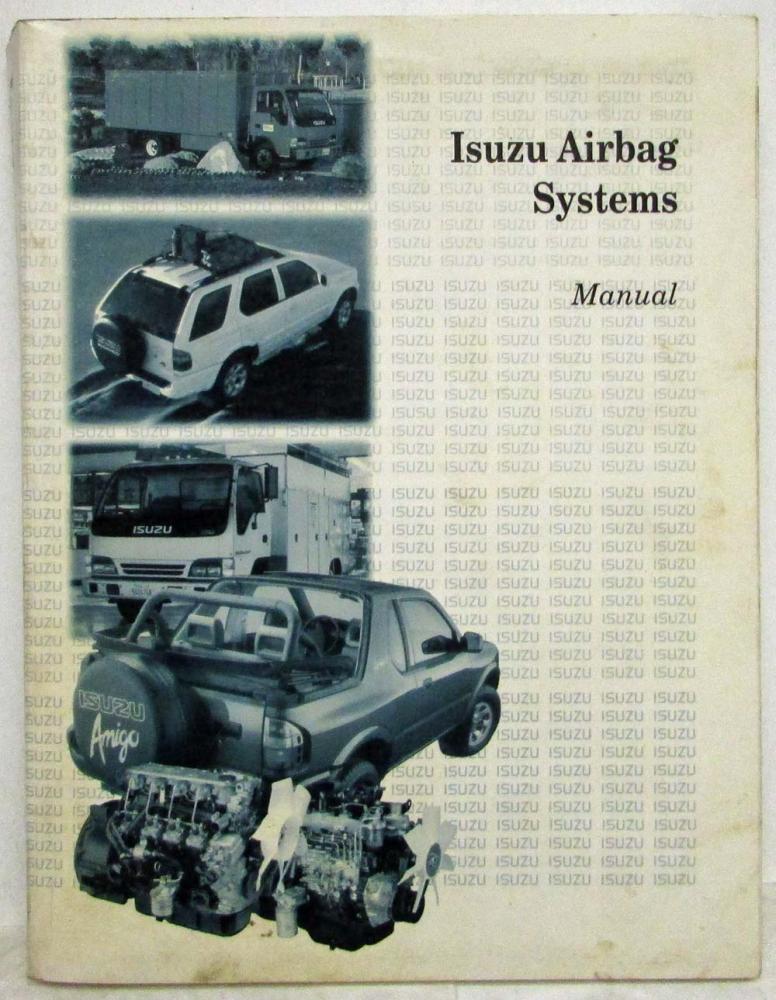 This Technician Guide introduces and descibes the operation and servicd of the 1990-Present (at the time) Isuzu Supplemental Restraint System (SRS), or Air Bag Systems. However, it is NOT intended to substitute the appropriate Workshop Manual(s) normally used on the job. The range of specifications and variations in procedures between models requires reference to the specific Isuzu Service Publication(s) when performing certain operations.