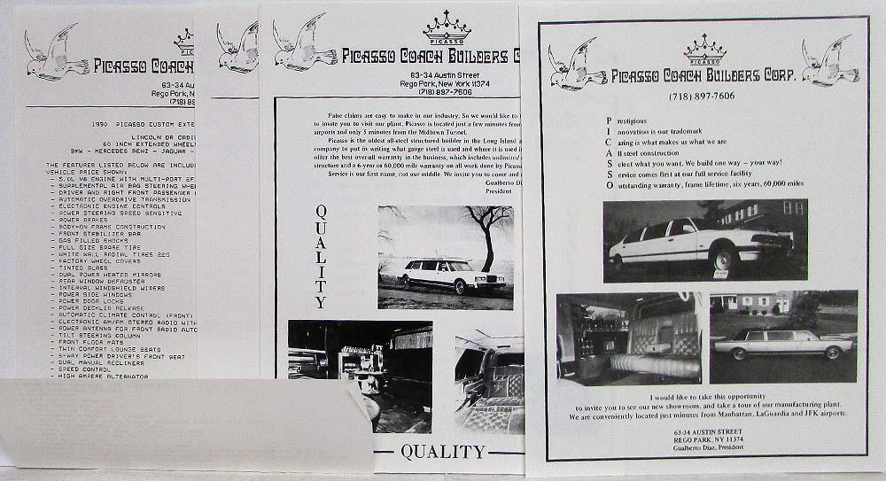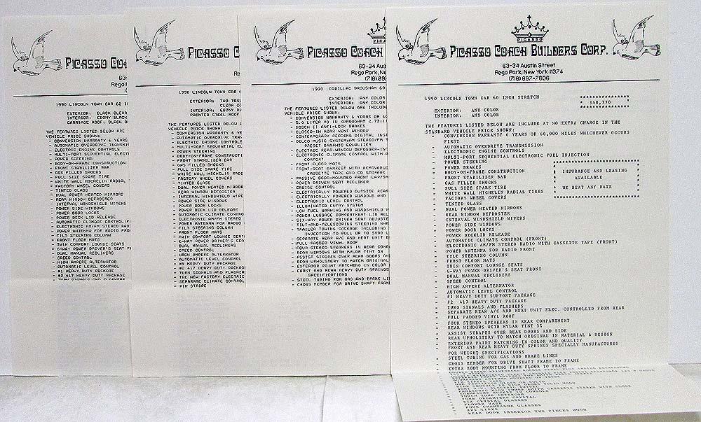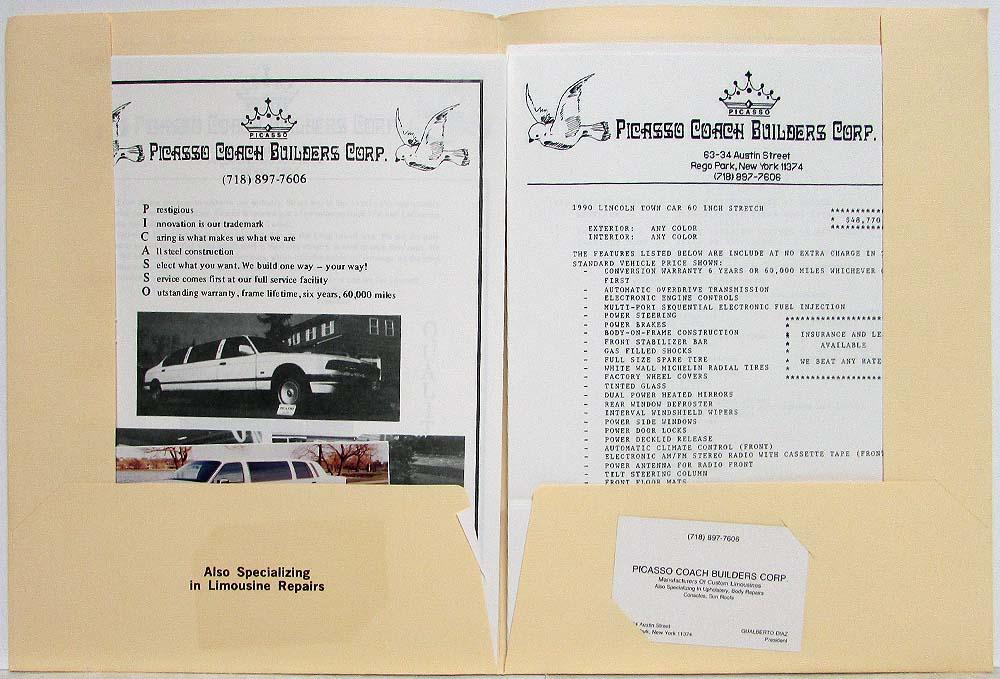 1990 Picasso Coach Builders Limo Specialists - Marketing Sales Folder Portfolio. Original. Shows pricing.