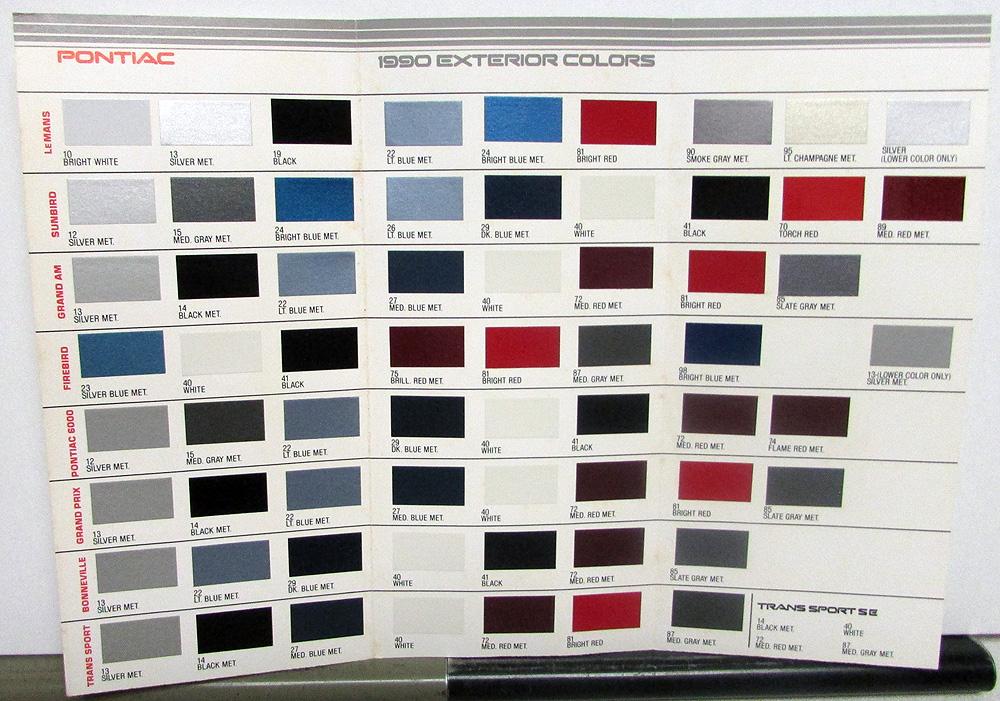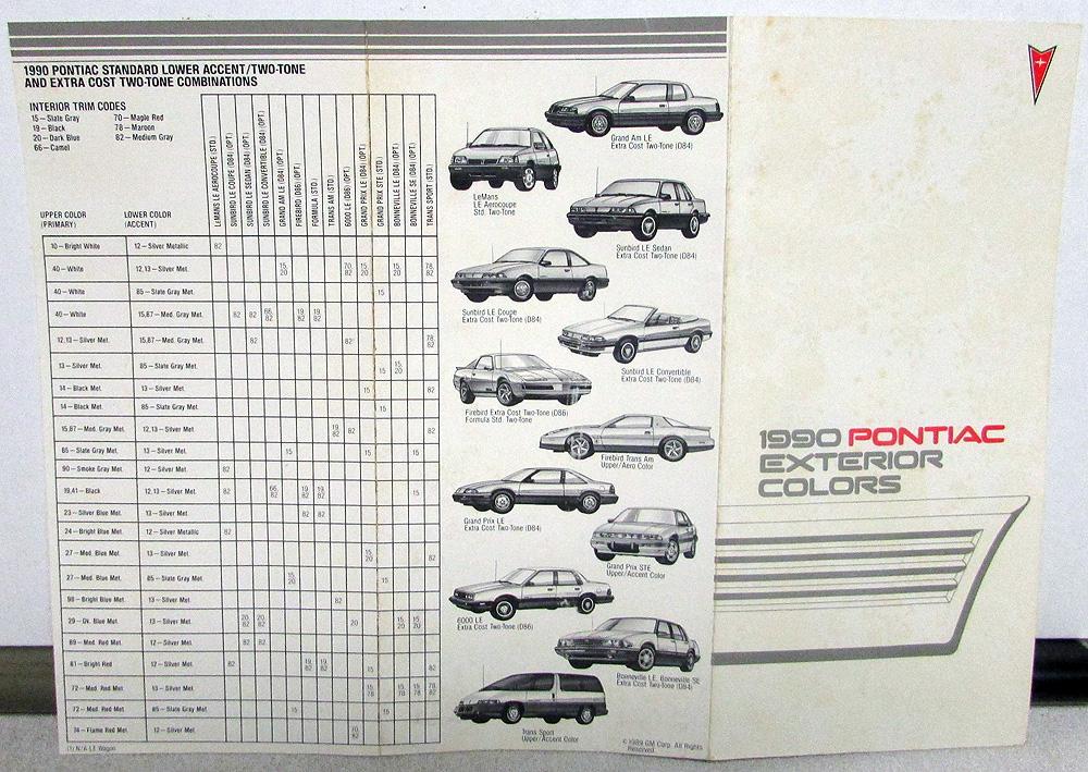 Original 1990 Exterior Colors Paint Chips for all the Pontiac vehicles, Trans Sport, & SE, Bonneville, Grand Prix, Pontiac 6000, Firebird, Grand Am, Sunbird, and LeMans.Paint chips in good condition. Includes interior trim codes and two-tone color combinations. Good used condition with some soiling and blemishing [see photos].