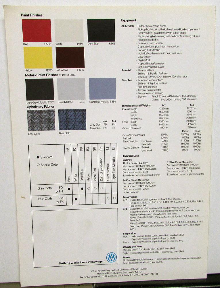 1990 Volkswagen United Kingdom Dealer Sales Brochure. This Folder highlights the VW Taro Pickup Models. It is in good condition with minor wear and soiling [see photos].