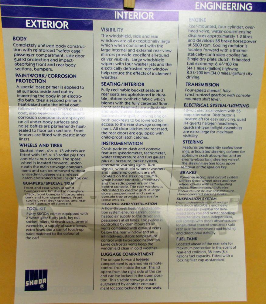 Original Skoda Sporty European driving for 85 years FACT GUIDE. List standard features, specifications, features and equipment of exterior, interior, and engineering. Includes dimensions. Very good condition. Folder is printed on two sides of one sheet of paper with two folds. No model or year is referenced. Think it is 1990s era.