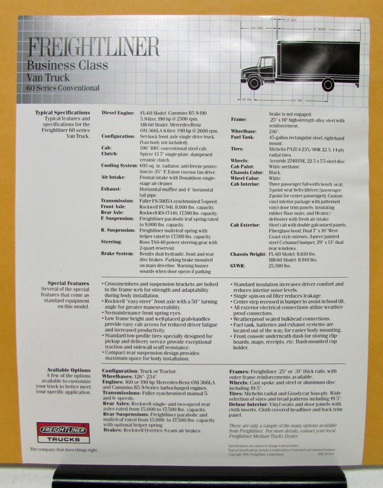 1991 Freightliner Series 60 Business Class Van Truck Specification Sheet.