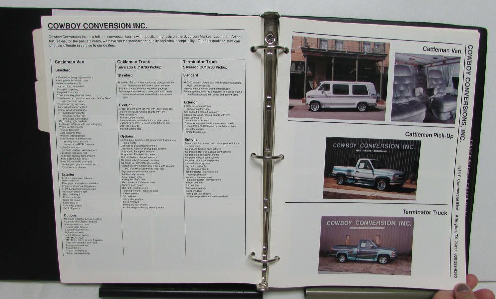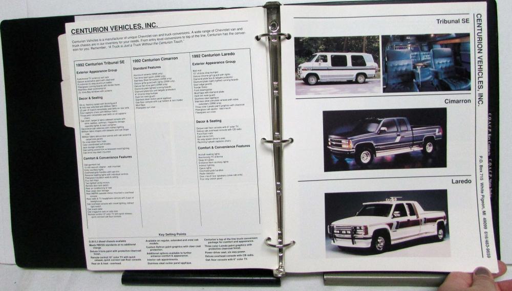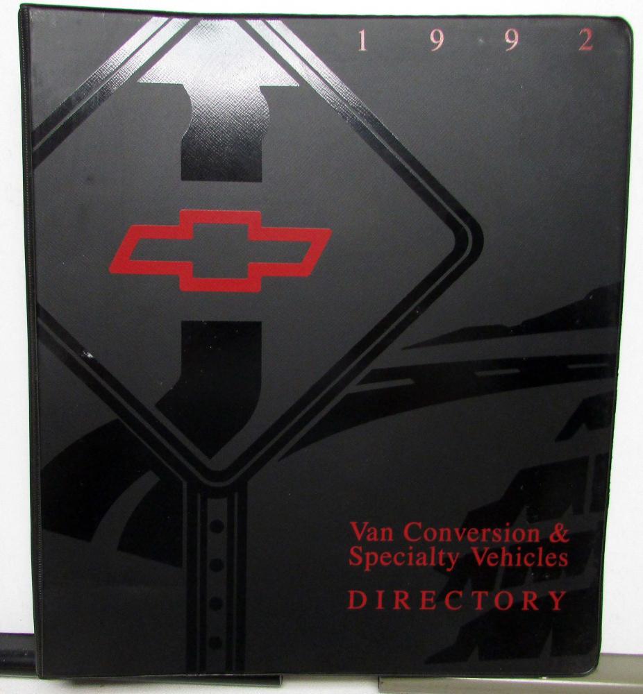 This is an original 1992 Chevrolet Van Conversion & Specialty Vehicles Directory. It is in good condition and was put together to be an easily accessed source of information for the salesmen to use when helping a customer place a personalized order, answering any question, or just promoting the businesses/specialty vehicles. Included are the color photos of the business's work, seating options, window treatments, interior appointments, and more. The tab "Chevrolets Winners Newsletter" Is empty, either the dealership did not add those when they came in, or they just were not ever mailed out, either one was a common occurrence.