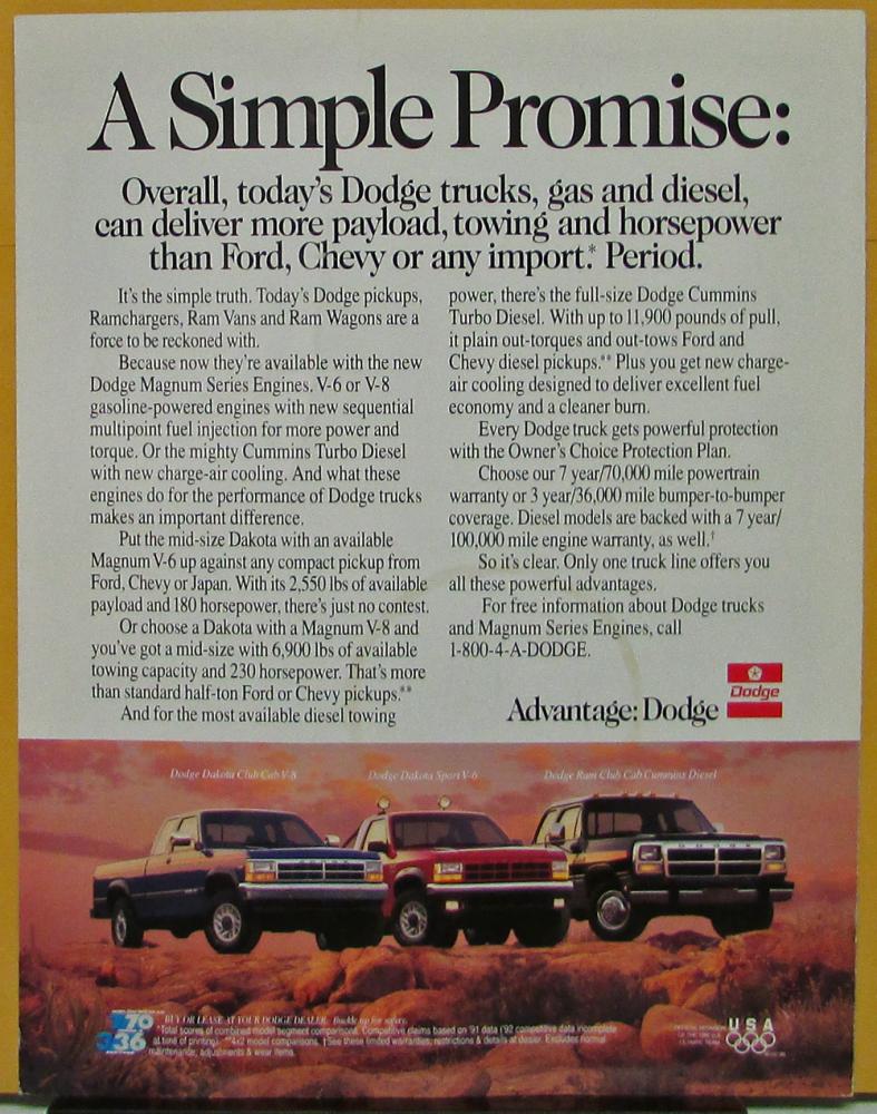 Original 1992 Dodge Dakota Club Cab winner of FOUR WHEELER magazine's pickup truck of the year award, color sales folder. Two sided printing on one sheet of paper with one center fold. Good condition. Minor stain on the page cover.