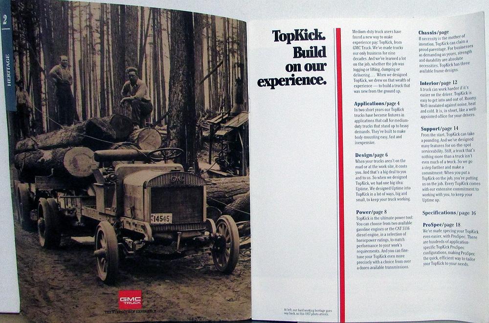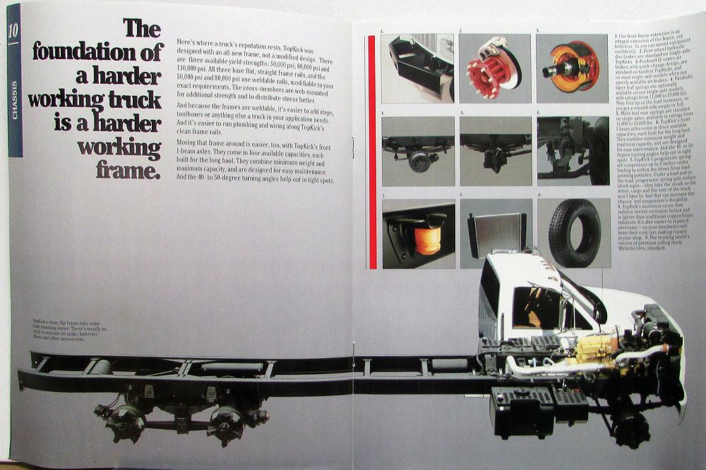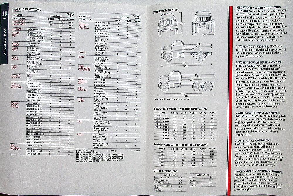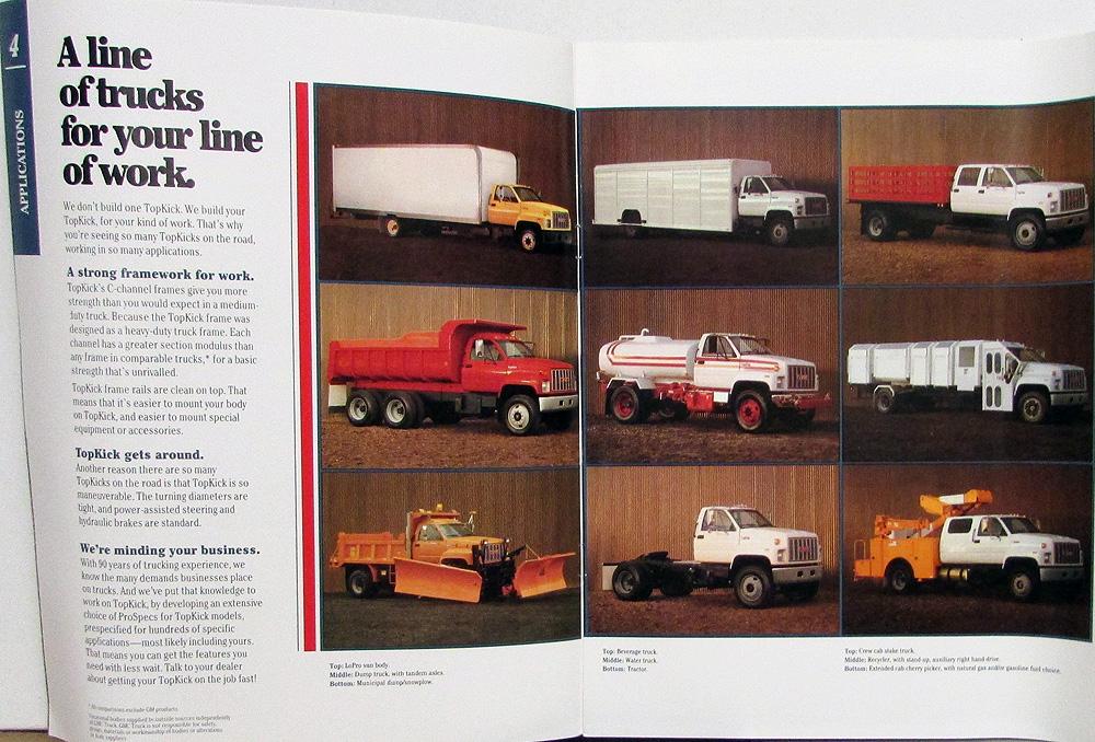 Original 1992 GMC Truck TopKick sales brochure. Read about applications, design, power, chassis, interior, support, specifications. Lots of photos, dimensions, body applications, features, chassis/frame, cab comfort, specifications for single and tandem axles, and more. Good, clean condition. 5014-92