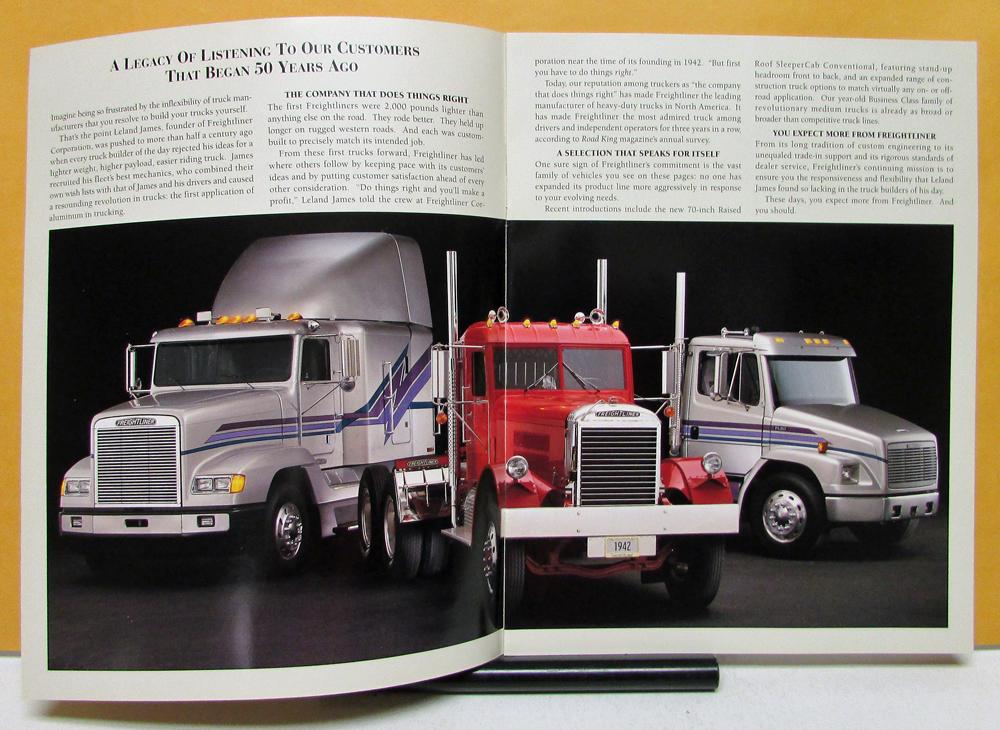 1993 Freightliner Truck Product Line Sales Brochure. Models included are FLD120, FLD112, FLC112, FLA Cab-Over-Engine, FLD120SD, FLD112SD, FLC112SD, 60 Series, 70 Series and 80 Series. Really nice picture of two of the models on the front page. The rest of the brochure then goes through each of the models showing pictures and giving information on features.