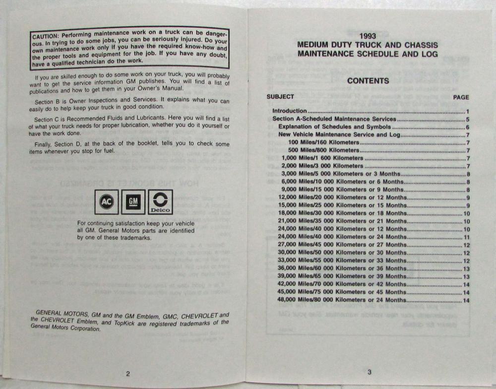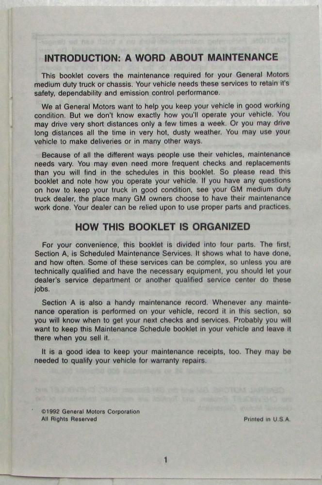 1992 GMC Medium Duty Truck and Chassis Maintenance Schedule Booklet. Original.