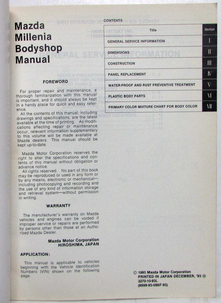 1993 Mazda Millenia Bodyshop Service Shop Repair Manual. Original.