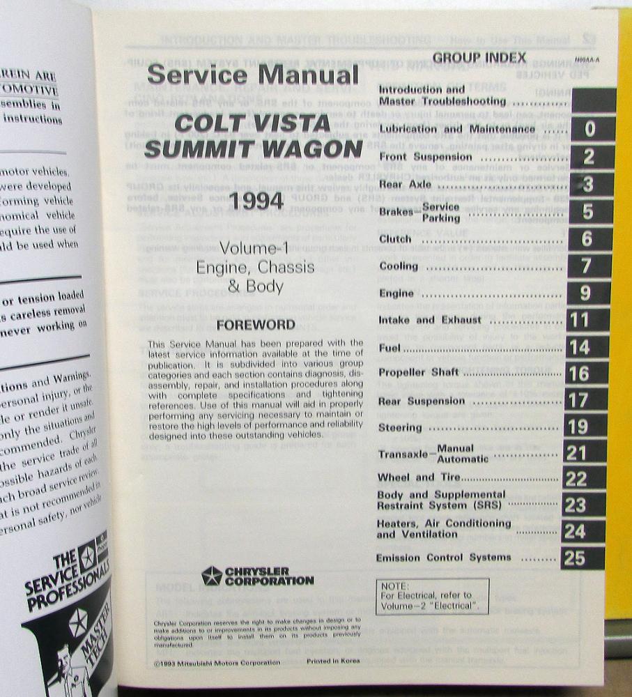 Original 1994 Dodge Colt Vista and Eagle Summit Wagon Dealer Service Manual Set. This 2 Volume Shop Manual Set is what the Dealer used to service and repair your Colt Vista or Summit Wagon. They have information, specifications, troubleshooting, procedures and illustrations to aid in repairing these Models.