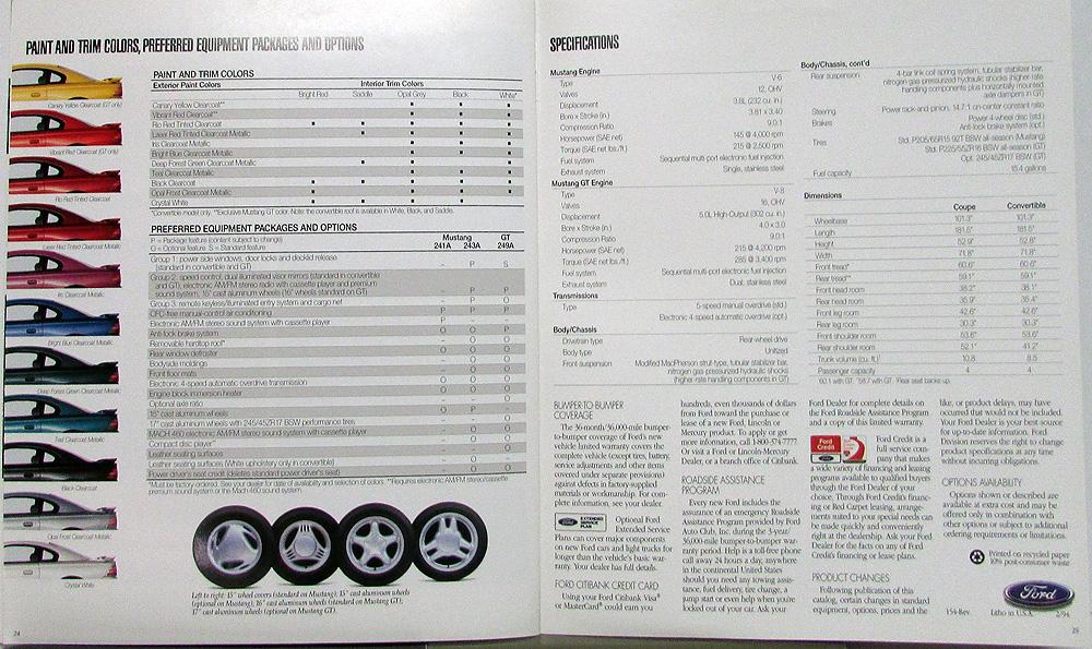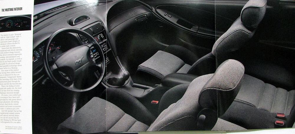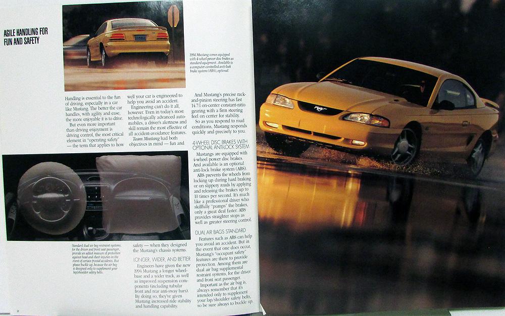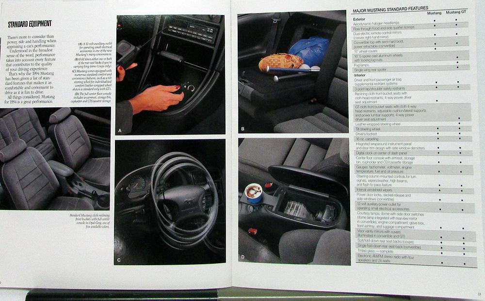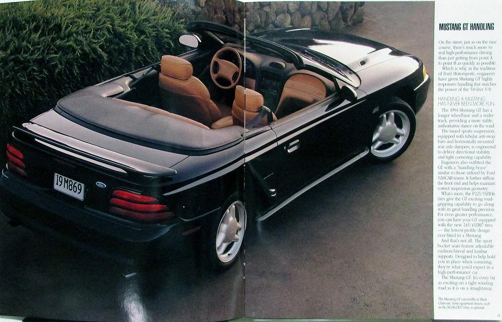 1994 Ford Mustang and Mustang GT color, glossy sales brochure featuring the convertible, power, handling, interior, sound system, factory-ordered removable hardtop (page 16), fold-out with cutaway of the car, standard equipment/features, paint, trim, packages, wheels, specifications and more. Very good condition.