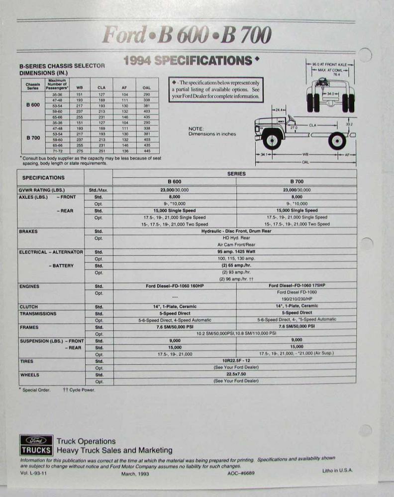 1994 Ford Truck B-Series B-600 B-700 School Bus Chassis Spec Sheet.