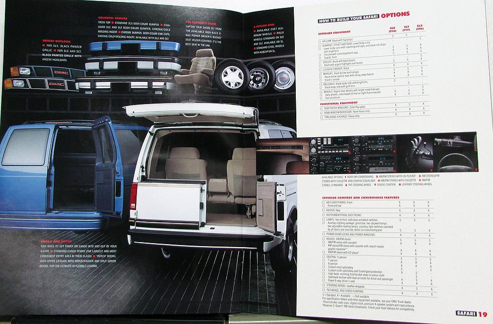 Original 1994 GMC Truck sales brochure for Vans (Rally and Vandura). Read about power/engines, environment/interior, capacity/seating and cargo, safety, how to build your Safari and Rally by selecting options, trim levels, and specifications. Printed on glossy paper. Good condition, clean. 7004-94.