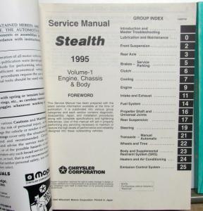 Original 1995 Dodge Stealth Dealer Service Manual Set. This 2 Volume Shop Manual Set is what the Dealer used to service and repair your Stealth Car. They have information, specifications, troubleshooting, procedures and illustrations to aid in repairing these Cars.