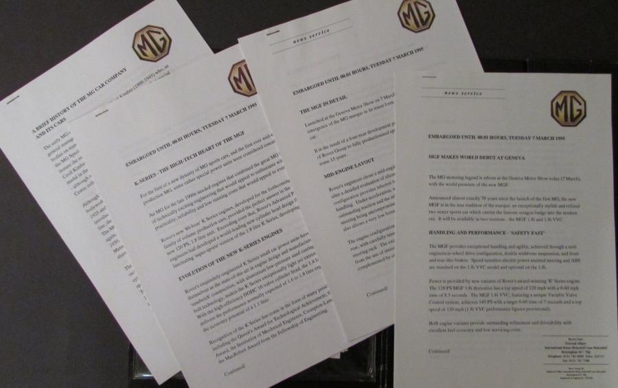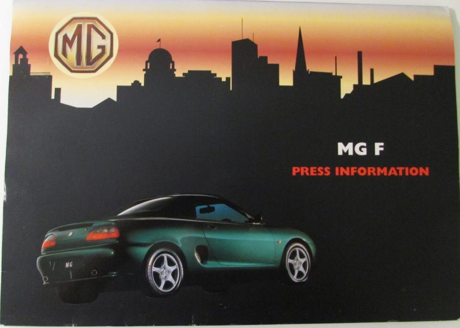 1995 MG F Press Information portfolio (press kit) with four press releases and twelve glossy color photos. Portfolio has clear inside pocket to hold the photos.
