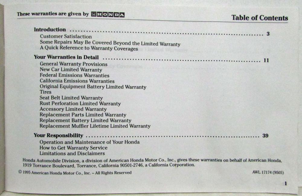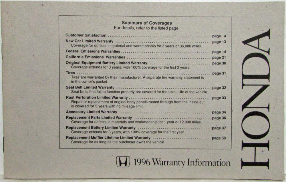 1996 Honda Warranty Information Manual. Original.