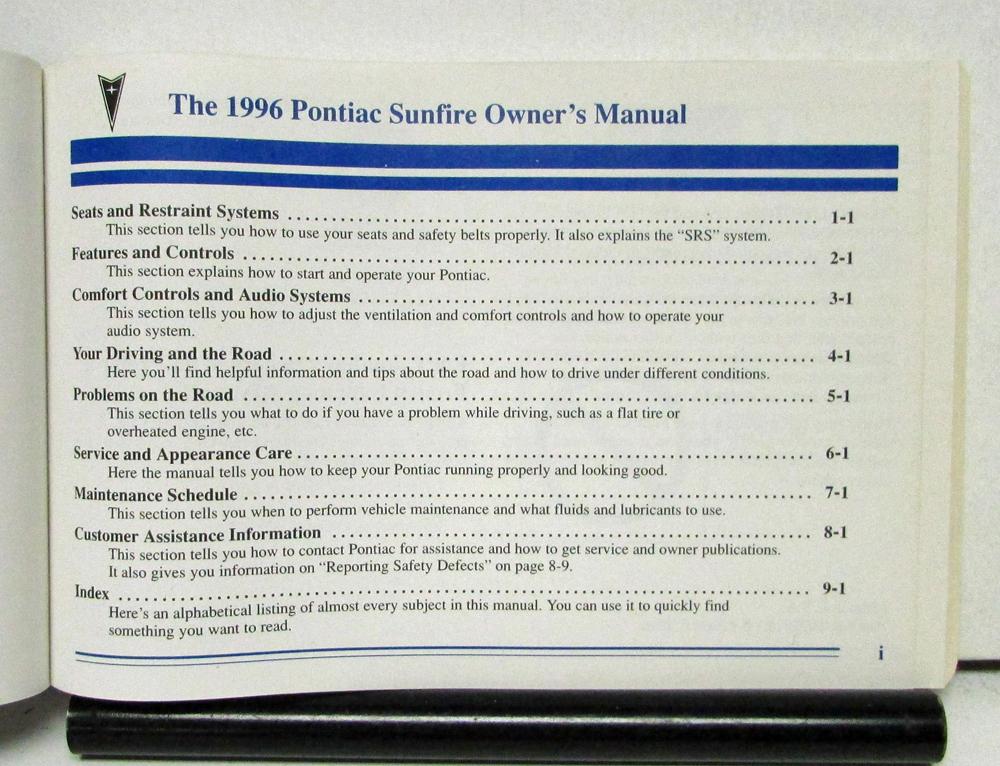 1996 Pontiac Sunfire Operator Owner's Manual Original. This manual contains operation, service/maintenance and general instructions along with illustrations.