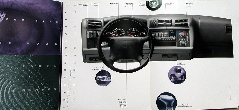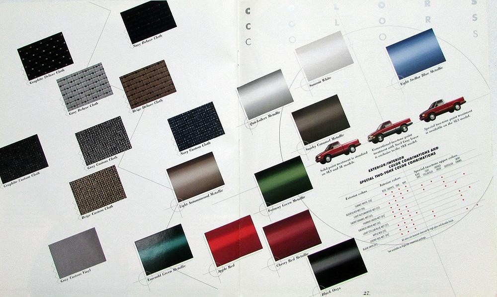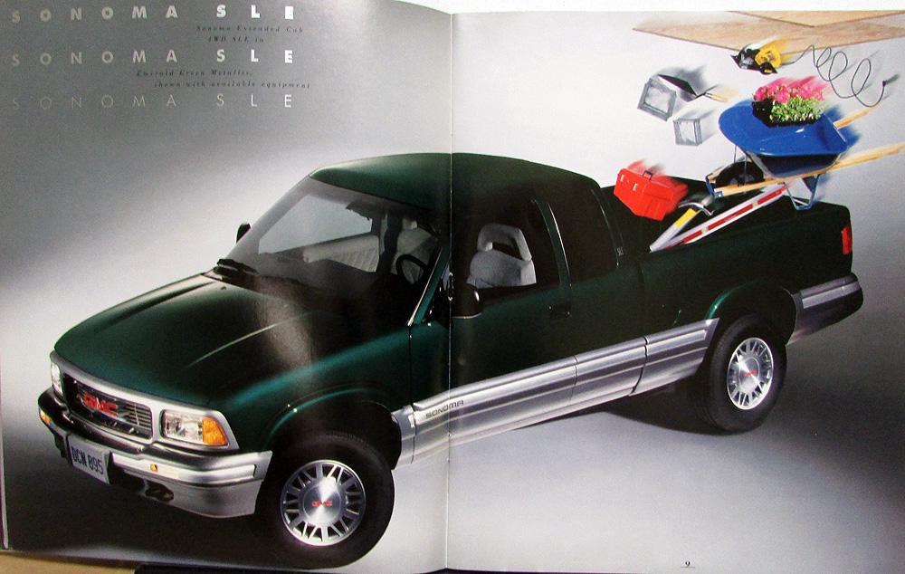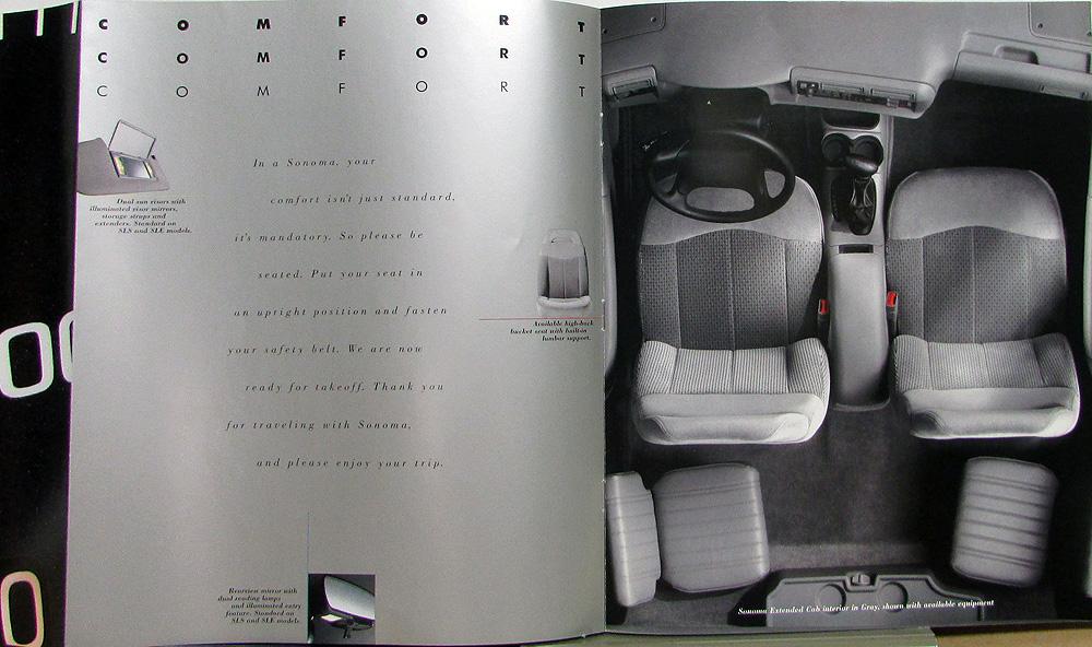 Original 1997 GMC sales brochure printed on glossy paper features the Sonoma pickup truck. Vibrant color captioned photos throughout. Read about the sportside, SLS, SLE, performance, capability, instrument panel, comfort, beds, color choices, trim levels, options, and more. Exterior, interior, mechanical equipament list. Engine specs, available engines, trailering data, technical data and more. Good, clean condition. 104-97.