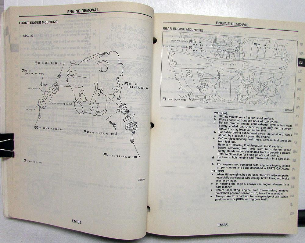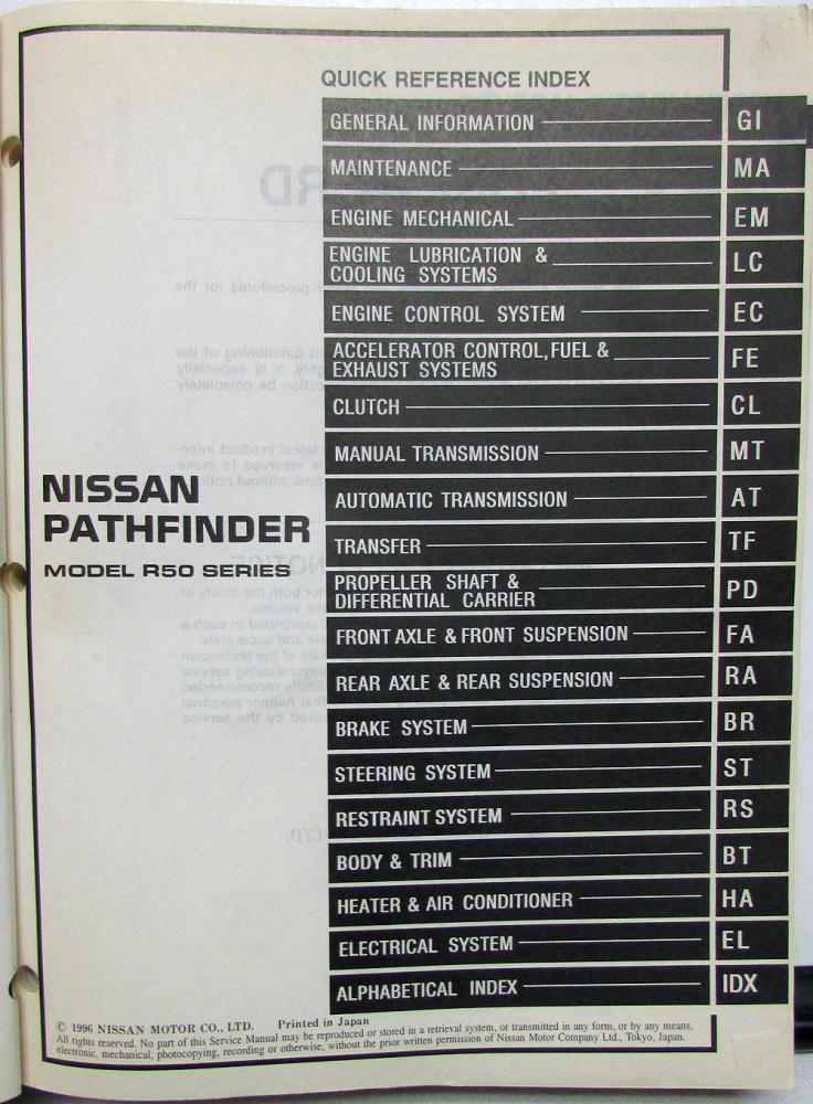 This manual contains maintenance and repair procedures for the 1997 Nissan Pathfinder. In order to assure your safety and the efficient functioning of the vehicle, this manual should be read thoroughly. It is especially important that the PRECAUTIONS in the GI section be completely understood before starting any repair task. The descriptions and specifications contained in the manual were in effect at the time of publication. Note: These manuals were never meant as restoration manuals, as that is not within the regular scope of work done by dealership service departments.
