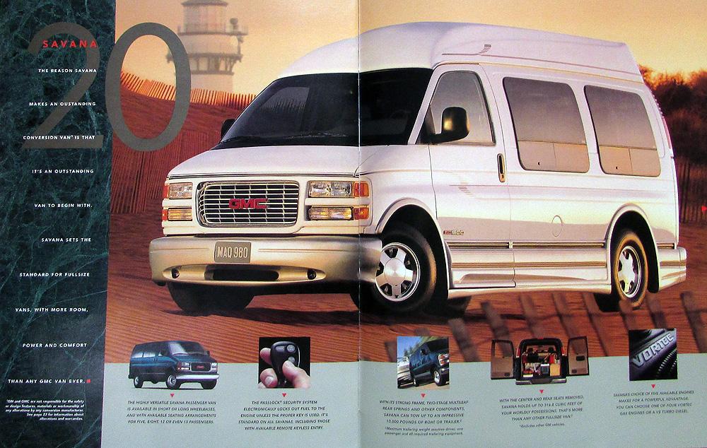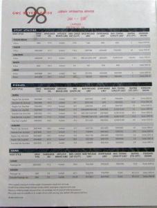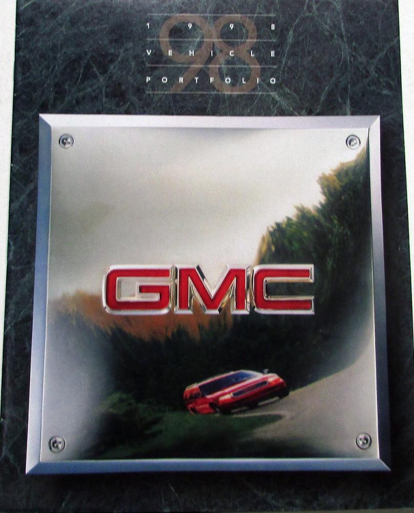 1998 Vehicle Portfolio (sales brochure) for GMC sport utilities, pickups, and vans. The back cover has condensed technical data to make decision on what vehicle to purchase. Each of the vehicles has a nice photo spread and highlight key features of the vehicle. Inside back cover has a card to return to GMC to obtain more information on specific vehicles. Good, clean condition, and there is a stamped imprint on the outside cover. 109-98R