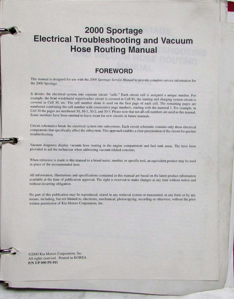 This Electronic Troubleshooting Manual (ETM) is designed for use with the 2000 Sportage Service Manual (NOT Included) to provide complete service information for the 2000 Sportage.