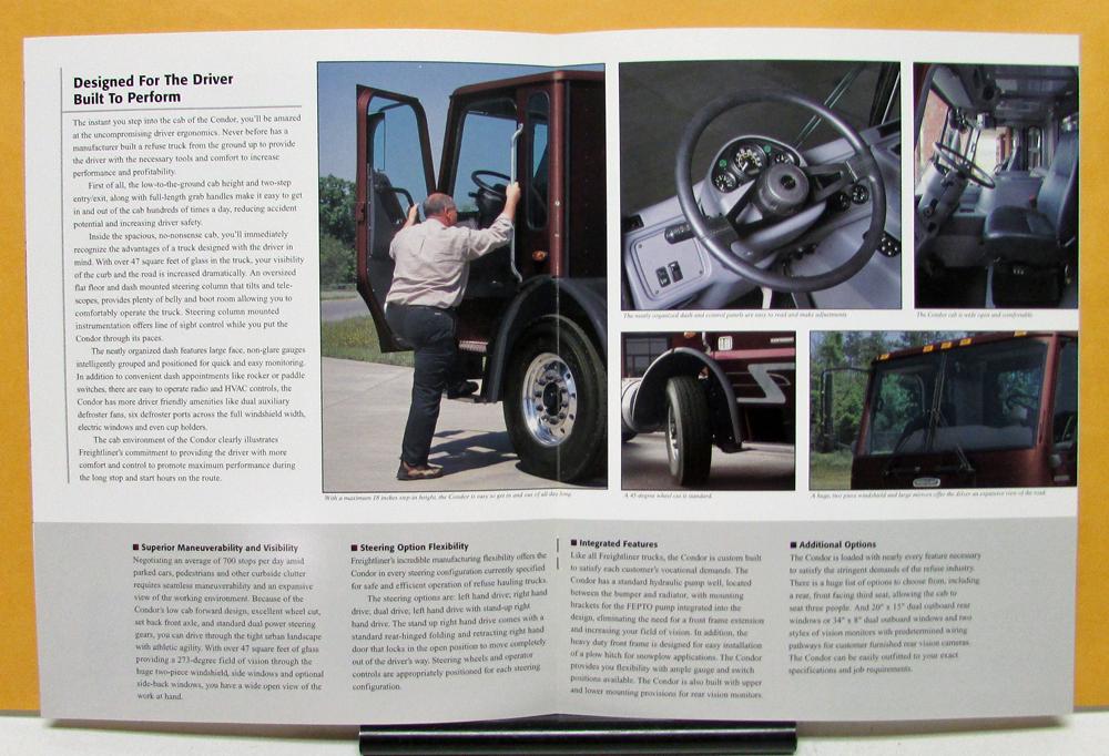 2000 2001 Freightliner Truck Model Condor "Low Cab Forward" Sales Brochure. The front page has a nice picture of the truck. The inside pages have additional pictures of the truck along with information on its use as a refuse truck. Also talks about how it is "Designed for the Driver - Built to Perform". Also talks about how it is "Engineered to Deliver Maximum Strength, Durability and Serviceability".