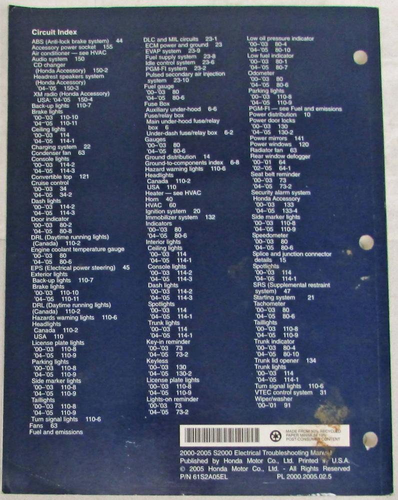 2000-2005 Honda S2000 Electrical Troubleshooting Service Manual. ORIGINAL.