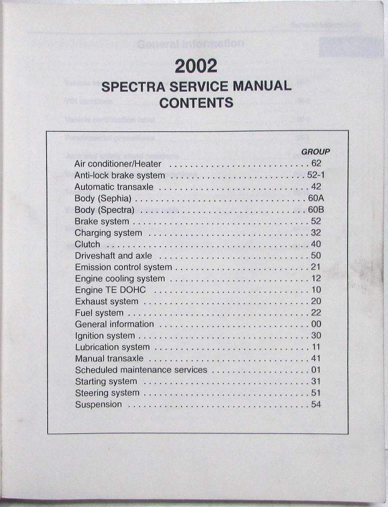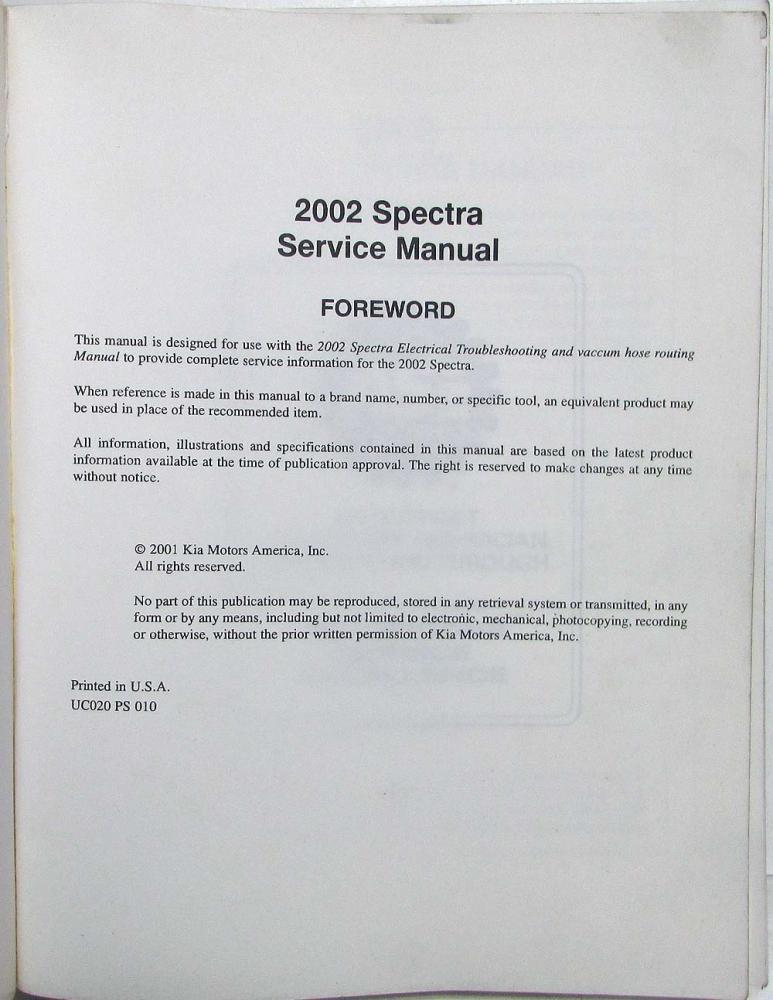 This shop manual is designed for use with the 2002 Spectra Electrical Troubleshooting and Vacuum Hose Routing Manual (NOT Included) to provide complete service information for the 2002 Spectra.
