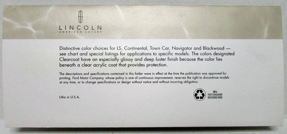 2002 Lincoln American Luxury Exterior Colors. Includes Color Availability by Model Chart and Lincoln Two-tone Color Combinations for Town Car Signature Series. Distinctive color choices for LS, Continental, Town Car, Navigator, and Blackwood.