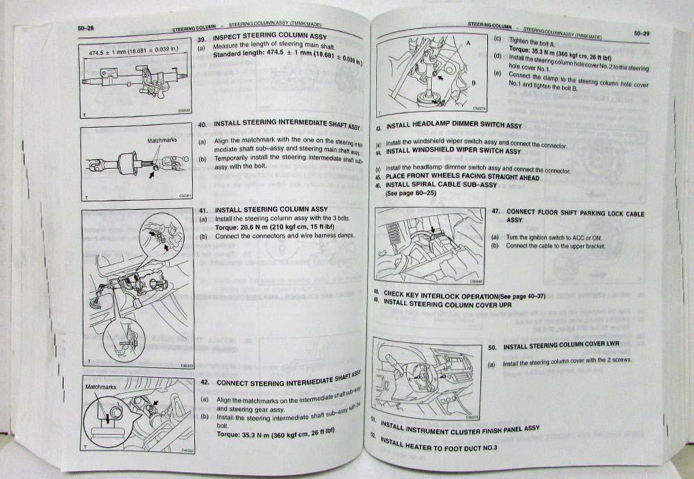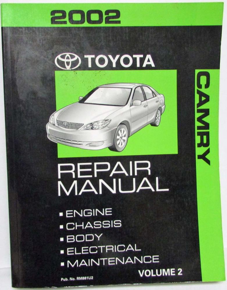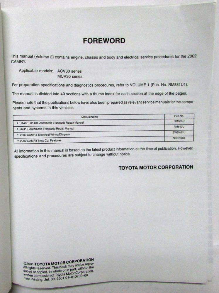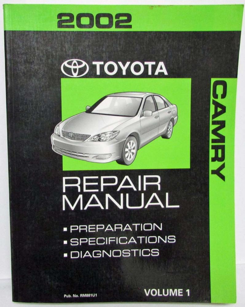 Volume 1 contains maintenance, preparation, specifications and diagnostics procedures for the 2002 Camry. Volume 2 contains repair procedures for the engine, chassis and body, and electrical service procedures. The descriptions and specifications contained in the manual were in effect at the time of publication. Note: These manuals were never meant as restoration manuals, as that is not within the regular scope of work done by dealership service departments.