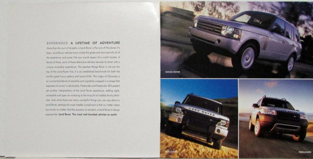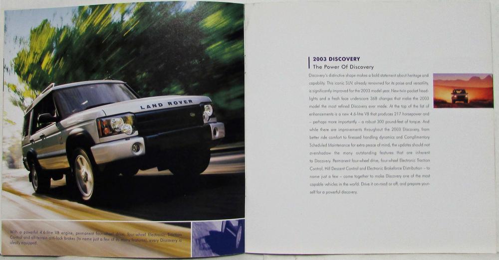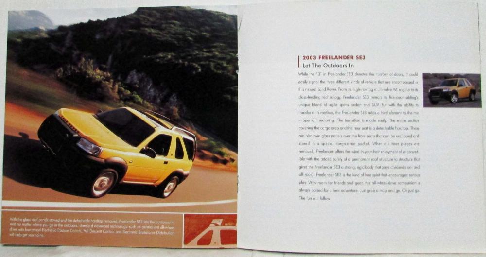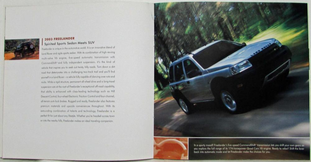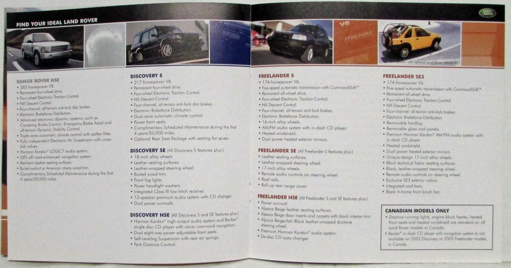 Promotes the 2003 range of Land Rover models: Range Rover, Discovery, and Freelander and includes specifications.
