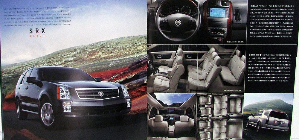 Original, color, sales brochure printed on cardstock for the 2004 Cadillac XLR, SRX, CTS, Seville STS, and Deville DHS models. Color chart. Photos and text. Japanese sales market/text.
