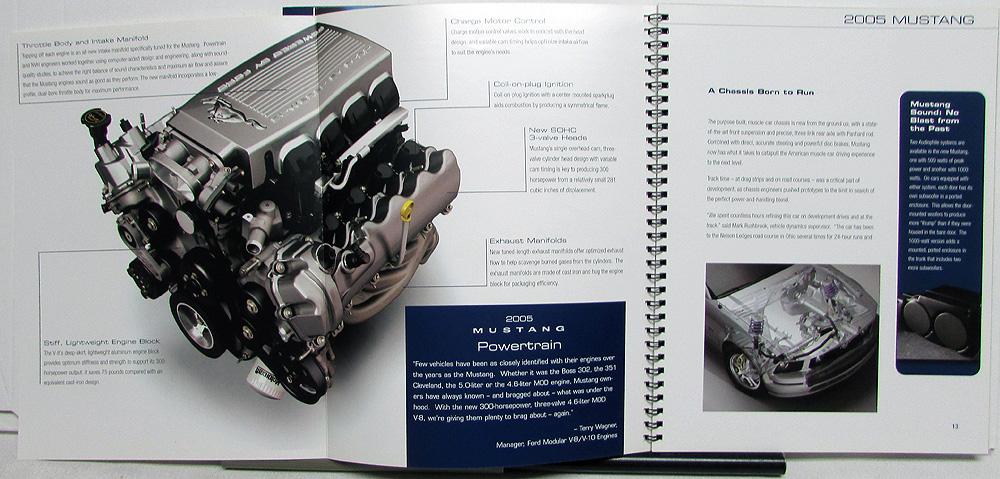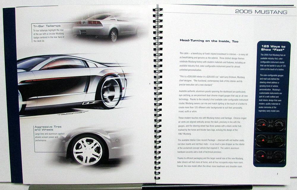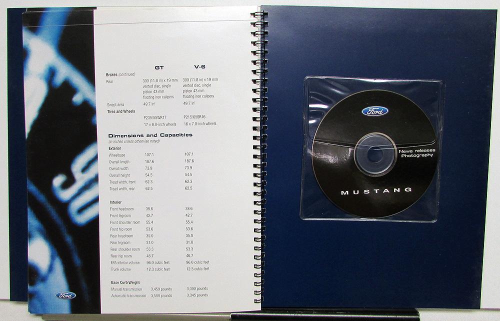 Original, spiral bound, press kit with preliminary release information and photographs. Nice photograhs, concept illustrations, design development, interior features, performance, chassis, safety features, evolution of the Mustang, preliminary specifications for GT and V-6. Many fold-out pages. Very good condition.