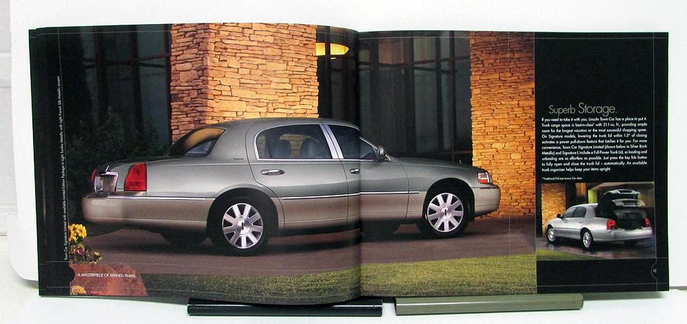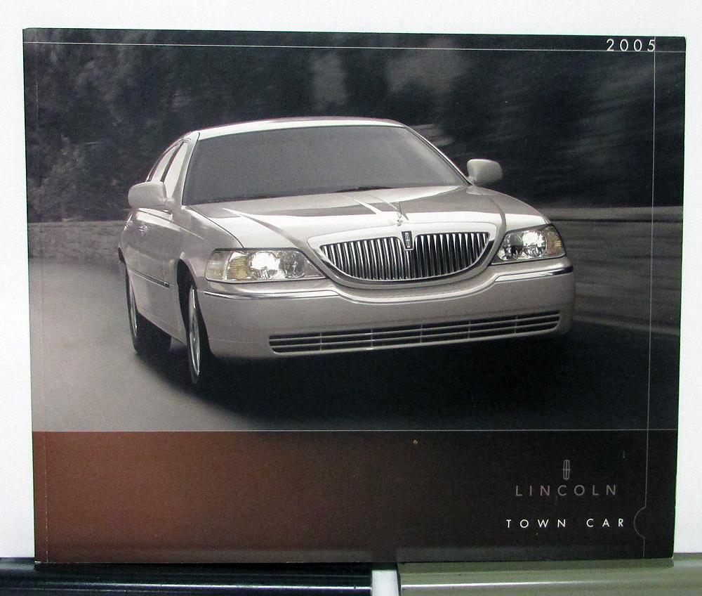 2005 Lincoln Town Car Sales Brochure & Specifications. This brochure is bound together more like a book versus using staples. The inside pages have several pictures of the Lincoln Town Car showing both the exterior and interior. The last few pages contain specifications. There is also a sleeve containing a Lincoln Trim Selector brochure.