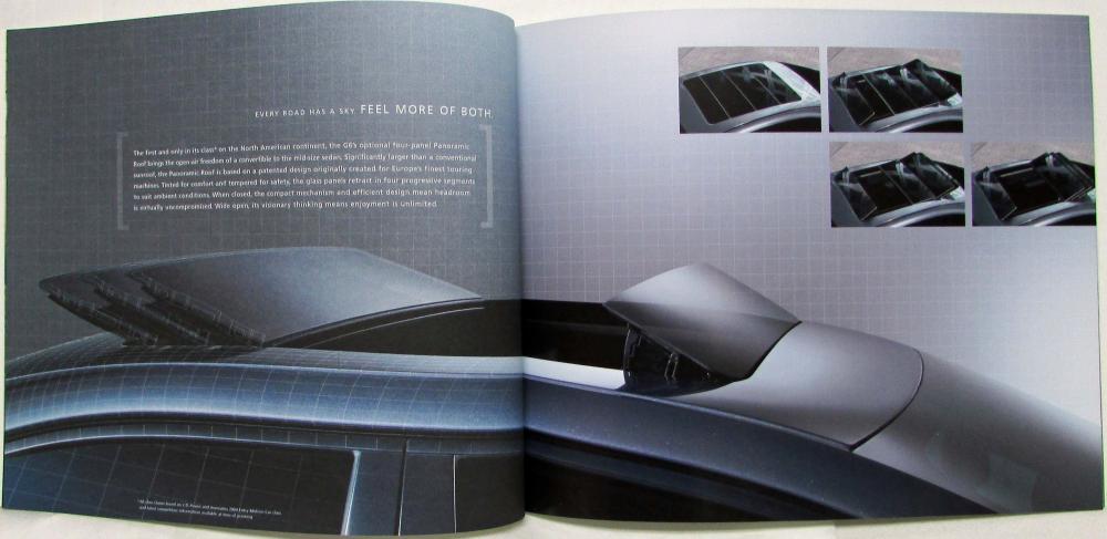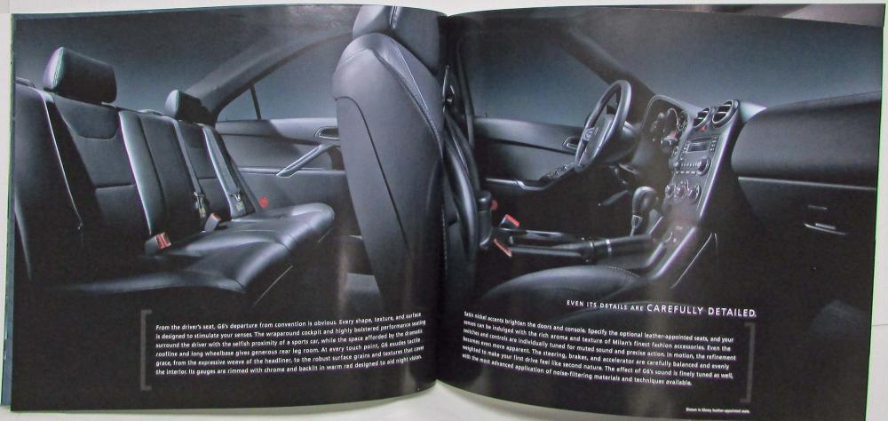 The 2005 Pontiac G6 is a midsize sedan that replaced the Grand Am in Pontiac’s lineup. It offers a 3.5-liter V-6 engine with 200 horsepower, a front-wheel drive layout, and a driver-oriented cockpit. The brochure highlights the car’s features, such as the optional panoramic roof and showcases its advantages in terms of style, performance, and value. The brochure has colorful photos, color and upholstery options and details on equipment and options of the G6.